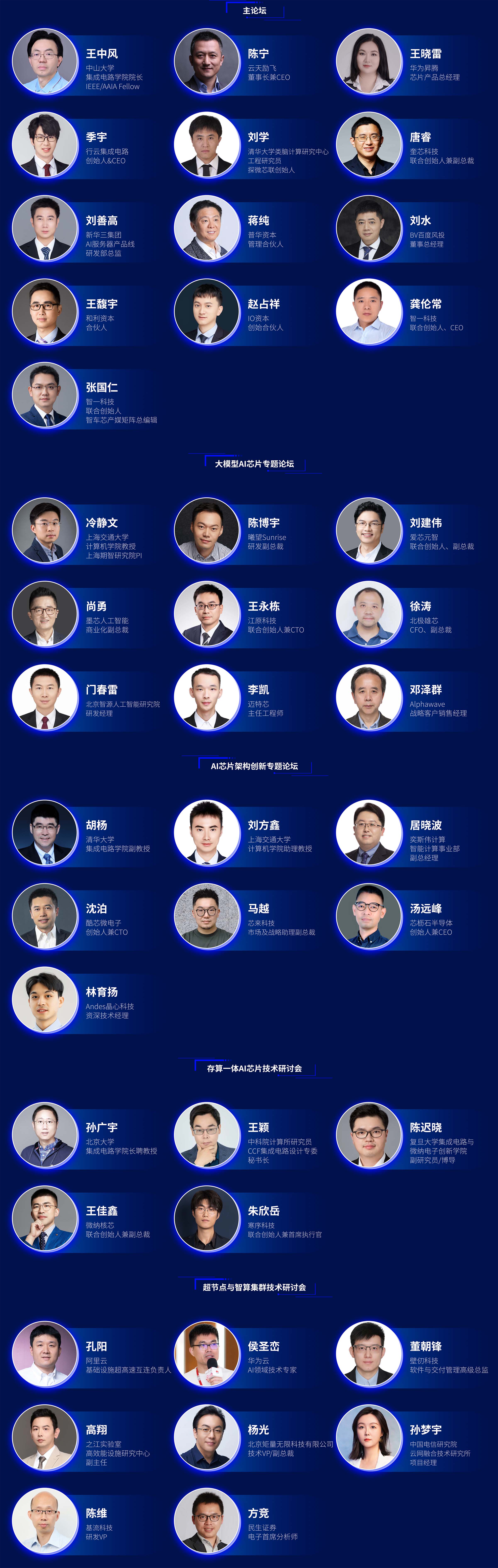 峰会为期一天,由一场主论坛,两场专题论坛和两个技术研讨会组成。其中,主论坛于上午在主会场+分会场一进行;大模型AI芯片专题论坛在主会场下午进行;AI芯片架构创新专题论坛在分会场一下午进行。